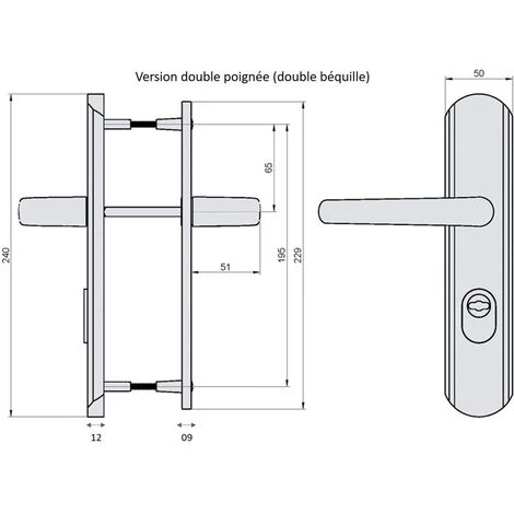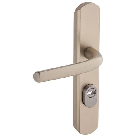 Poignée de porte blindée avec multiples entraxes pour une fixation universelle. Modèle de poignée compatible avec la grande majorité des portes. Plusieurs formats d’entraxes sont possibles : 170, 175, 195, 208 et 216 mm. La plus grosse difficulté dans une poignée blindée réside dans le fait de trouver un modèle compatible avec sa serrure existante. En effet, il est trop risqué d’improvisé des trous dans votre serrure. Il est donc obligatoire de trouver un modèle compatible avec votre poignée actuelle. La poignée blindée Vachette Sécumax Up dispose d’un grand nombre de possibilités d’entraxes pour une pose possible dans la majorité des cas. Important à vérifier avant l’achat : 1/ L’épaisseur de la porte doit être comprise entre 3,8 et 4,7 cm (standard le plus commun) ; Si votre porte fait entre 3,5 et 3,7 cm ou alors entre 4,8 et 6,8 cm alors il vous faut un kit de rallonge spécial. Contactez-nous pour plus d’informations. 2/ Entraxe principale entre le centre de la poignée et la fente de la serrure doit être de 7 cm (standard le plus commun) 3/ Contrôlez que votre entraxe entre la ou les vis de fixations est compatible avec une des dimensions de la poignée blindée (Plus de détails sur l’image). 4/ Le dépassement de votre cylindre de porte (serrure de la porte) à l’extérieur (par rapport à la porte) doit être compris entre 1 cm et 1,5 cm. Cela va permettre d’avoir assez de longueur pour compenser l’épaisseur de la plaque extérieure et du protège cylindre. Si votre cylindre ne dépasse pas suffisamment il vous suffit d’en changer et d’en commander un plus long en vous rendant sur notre page de cylindre de sécurité. Très dissuasif contre les tentatives d’effraction. Poignée de porte blindée Vachette sans vis apparente, finition très propre. Carré de la poignée de 7 mm (8mm en option). Pastille anti perçage pour une protection maximale. Effet monobloc sandwich très résistant entre la plaque/poignée extérieur et celle intérieur. Pose de la poignée blindée : 1/ Positionnez la poignée côté extérieur avec le protège cylindre emprisonné à l’intérieur. 2/ La plaque noire avec tous les entraxes se fixent à l’intérieur et permet de faire l’effet sandwich en se vissant dans la poignée extérieure de l’autre côté. 3/ La plaque décorative se pose à l’intérieure pour cacher toutes les vis. Protège cylindre en acier inoxydable, plaque intérieure avec capot et sous-plaque en aluminium massif. Béquille en aluminium. Garantie 10 ans. Couleur Champagne. (Existe aussi en couleur Grise) Facile à poser avec la visserie fournie et la notice. Cette poignée blindée est un excellent rapport qualité prix qui offre une sécurité et une performance élevée. Dimensions : Entraxe serrure 70 mm Epaisseur de porte de 40 mm Configurations de pose pour entraxes : 170, 175, 195, 208 ou 216 mm. Exemple : Poignée de porte blindée entraxe 195. Plaque extérieure : 5 cm de large, 23,8 cm de longueur, 1,2 cm d’épaisseur.