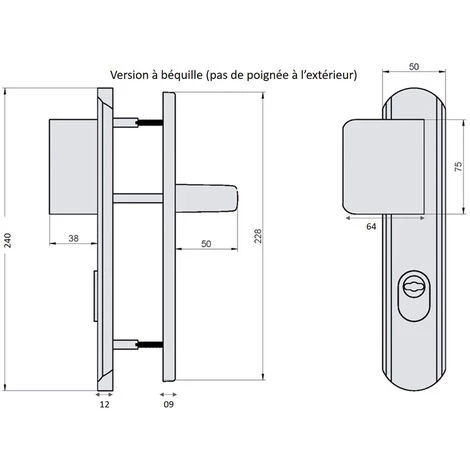 Poignée de porte blindée en version palière avec multiples entraxes pour une fixation universelle. Modèle de poignée compatible avec la grande majorité des portes. Plusieurs formats d’entraxes sont possibles : 170, 175, 195, 208 et 216 mm. La plus grosse difficulté dans une poignée blindée réside dans le fait de trouver un modèle compatible avec sa serrure existante. En effet, il est trop risqué d’improvisé des trous dans votre serrure. Il est donc obligatoire de trouver un modèle compatible avec votre poignée actuelle. La poignée blindée Vachette Sécumax Up dispose d’un grand nombre de possibilités d’entraxes pour une pose possible dans la majorité des cas. Il s’agit ici de la version palière : pas de poignée à l’extérieur. Vérifiez bien avant votre achat que la gache de votre serrrure s’active automatiquement lors du dévérouillage de votre cylindre sans quoi vous ne pourrez pas rentrer chez vous. Il existe aussi une version double poignée avec une poignée de chaque côté. Important à vérifier avant l’achat : 1/ L’épaisseur de la porte doit être comprise entre 3,8 et 4,7 cm (standard le plus commun) ; Si votre porte fait entre 3,5 et 3,7 cm ou alors entre 4,8 et 6,8 cm alors il vous faut un kit de rallonge spécial. Contactez-nous pour plus d’informations. 2/ Entraxe principale entre le centre de la poignée et la fente de la serrure doit être de 7 cm (standard le plus commun) 3/ Contrôlez que votre entraxe entre la ou les vis de fixations est compatible avec une des dimensions de la poignée blindée (Plus de détails sur l’image). 4/ Le dépassement de votre cylindre de porte (serrure de la porte) à l’extérieur (par rapport à la porte en elle même) doit être compris entre 1 cm et 1,5 cm. Le cylindre ne doit donc pas être à fleur de porte car nous allons rajouter une épaisseur avec la poignée secumax up Vachette. Il faut donc un dépassement de 1 cm à 1,5 cm car cela va permettre d’avoir assez de longueur pour compenser l’épaisseur de la plaque extérieure et du protège cylindre. Si votre cylindre ne dépasse pas suffisamment il vous suffit d’en changer et d’en commander un plus long en vous rendant sur notre page de cylindre de sécurité. Très dissuasif contre les tentatives d’effraction. Poignée de porte blindée Vachette sans vis apparente, finition très propre. Carré de la poignée de 7 mm (8mm en option). Pastille anti perçage pour une protection maximale. Effet monobloc sandwich très résistant entre la plaque/poignée extérieur et celle intérieur. Pose de la poignée blindée : 1/ Positionnez la poignée côté extérieur avec le protège cylindre emprisonné à l’intérieur. 2/ La plaque noire avec tous les entraxes se fixent à l’intérieur et permet de faire l’effet sandwich en se vissant dans la poignée extérieure de l’autre côté. 3/ La plaque décorative se pose à l’intérieure pour cacher toutes les vis. Protège cylindre en acier inoxydable, plaque intérieure avec capot et sous-plaque en aluminium massif. Béquille en aluminium. Garantie 10 ans. Disponible en 3 couleurs : Anodinox, Argent ou Champagne. (Il s’agit ici de la version Anodinox) Facile à poser avec la visserie fournie et la notice. Cette poignée blindée est un excellent rapport qualité prix qui offre une sécurité et une performance élevée. Deux versions disponibles : (Il s’agit ici de la version palière) Version double poignée = poignée de chaque côté de la porte ; Version Palière = pas de poignée côté extérieur. Pour la version palière, assurez-vous que la gâche de votre serrure soit automatique (c’est à dire que le déverrouillage du cylindre entraine aussi la gâche automatiquement ce qui vous permettra d’ouvrir la porte malgré le fait que vous n’ayez pas de poignée à l’extérieur). Dimensions : Entraxe serrure 70 mm Epaisseur de porte de 35 mm à 68 mm. Configurations de pose pour entraxes : 170, 175, 195, 208 ou 216 mm. Exemple : Poignée de porte blindée entraxe 195. Plaque extérieure : 5 cm de large, 23,8 cm de longueur, 1,2 cm d’épaisseur.