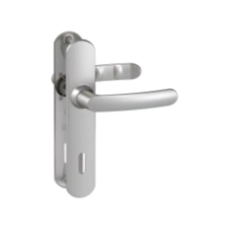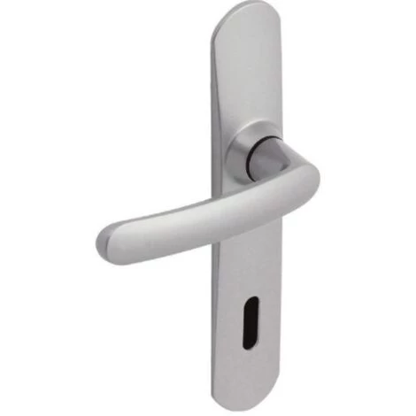 Poignées de porte avec plaque, entraxe 165 mm, clé L, chromées miroir Vachette référence 74694.