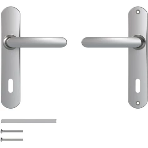 Contenus du colis : 2 béquilles sur plaques avec tige carrée et vis de fixation, le tout formant un ensemble pour équiper une porte.
