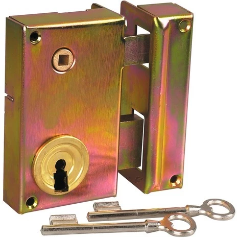 Coffre acier zingué blanc. 1/2 tour réversible tirantPêne allongé de 5 mmSpécial grilleFouillot carré de 7 mm2 clésH. 128 x l.