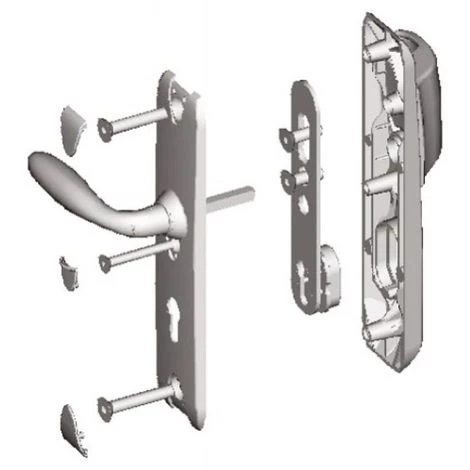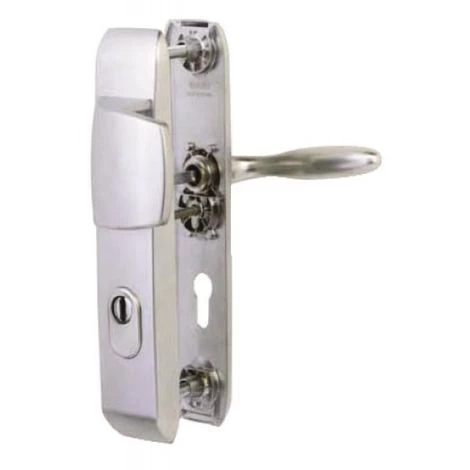 Ensembles palières de sécurité équipés de béquilles doubles ou béquille et poignée de tirage. Pour serrure axe à 50 mm minimum, entraxe 70 mm. Épaisseur porte 40 mm, sur demande kits de fixation pour épaisseurs 45 et 50 mm.Fixation invisible. Plaques de 250 x 55 mm. Saillie de la béquille 54 mm et saillie palière 56 mm.