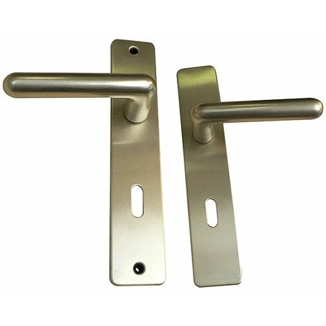 Ensemble Golf 90, entraxe EA 70 mm, entraxe de fixation 195 mm. Fourni avec vis et tige carrée de 7 mm. Plaque de 220 x 42 mm, saillie 58 mm. Trou de clé L pour pêne dormant 1/2 tour, alu anodisé champagne, Trou de clé L pour pêne dormant 1/2 tour
