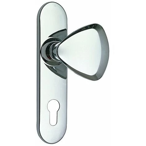Ensemble jazz porte palière, réversible, trou de clé I en zamak chromé brillant.Entraxe EA 70 mm.Fourni avec vis et tige carrée de 7 mm.Saillie de la béquille : 56 mm.Entraxe de fixation 165 mm.Plaque de 185 x 41 mm, Porte palière, réversible, trou de clé I