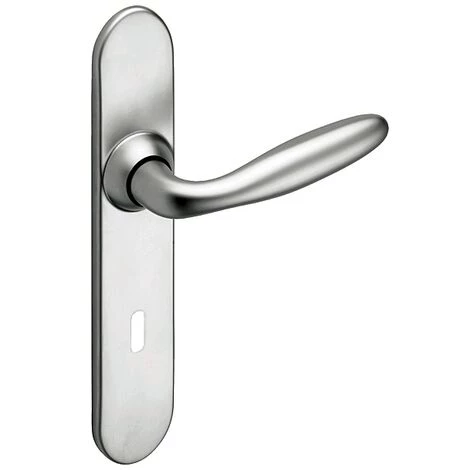 Ensemble Opéra en zamak chromé satiné, entraxe EA 70 mm, entraxe de fixation 195 mm. Fourni avec vis et tige carré de 7 mm.Ergonomique. Qualité et durabilité. Plaque de 215 x 41 mm. Saillie de la béquille : 64 mm. Trou de clé L pour pêne dormant 1/2 tour, Trou de clé L