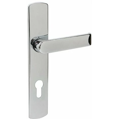 Ensemble Riv Bloc en zamak chromé, entraxe EA 70 mm. Entraxe de fixation 195 mm. Fourni avec vis et tige carrée de 7 mm. Plaque de 220 x 40 mm. Saillie de la béquille 60 mm. Trou de clé I, 1 côté saillie réduite, Trou de clé I, 1 côté saillie réduite