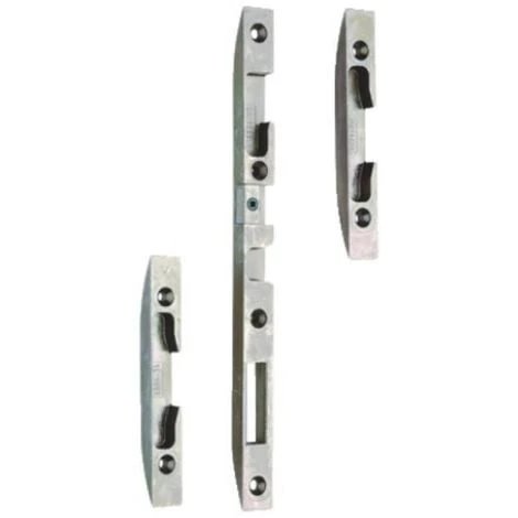 En acier zingué. Coffre de : 210 x 70 x 13 mm (axe à 50 mm) ou 210 x 60 x 13 mm (axe à 40 mm). Têtière de 2150 x 18 x 2,5 mm recoupable. Fouillot de 7 mm, axe à 1045 mm du sol. Entraxe : 70 mm. Condamnation des 3 points de verrouillage par la béquille ou par claquement de la porte. Relèvement possible de la poignée à 90° permettant l’ouverture d’un châssis vitré. Pêne dormant en acier, à 1 tour de clé. Descente forcée des galets par relevage de la béquille. Rouleaux réglables. Main universelle.