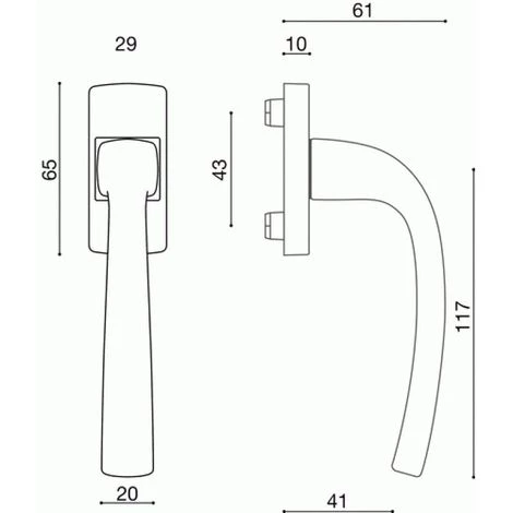 Leviers pour ouvrants à la française et oscillo-battants. Carré de 7 mm, dépassant de 35. Plots de 10 mm. Entraxe de fixation : 43 mm. Indexage : 90°.