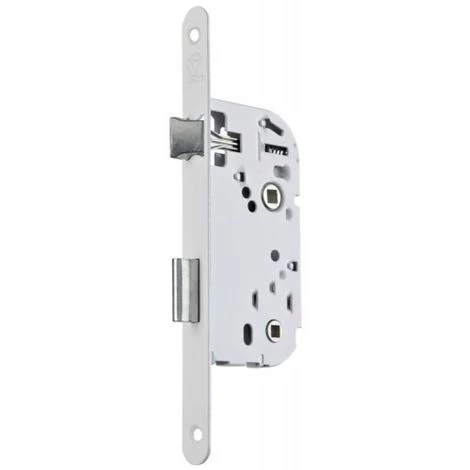Pour construction économique. Réversibles sans démontage du coffre. Coffre en acier 10/10° : 135 x 62 mm en axe à 40 mm et 135 x 72 mm en axe à 50 mm. Têtière bouts ronds : 230 x 20 mm. Entraxe : 70 mm. Fouillot carré : 7 mm. Demi-tour laitonné. Trous de passage des vis de rosace. Finition : laqué blanc.