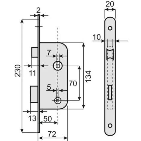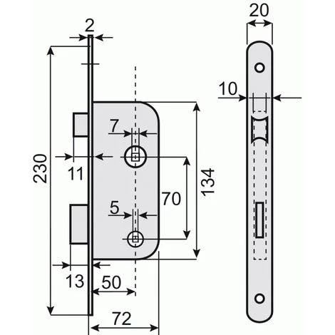 Serrures à larder D 10 Serrure à larder pêne demi-tour et pêne dormant à condamnation axe 40 mm – Têtière bouts ronds -D13 Fouillot de condamnation carré : 6 mm.