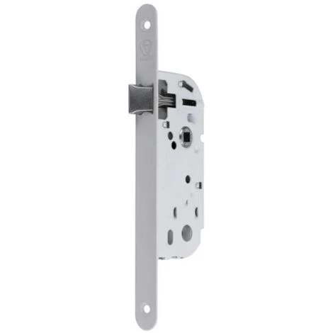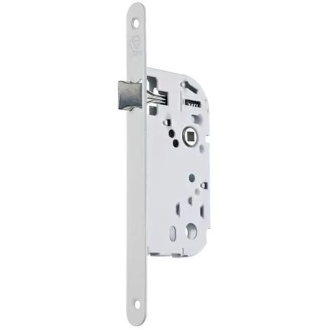 Pour construction économique. Réversibles sans démontage du coffre. Coffre en acier 10/10° : 135 x 62 mm en axe à 40 mm et 135 x 72 mm en axe à 50 mm. Têtière bouts ronds : 230 x 20 mm. Entraxe : 70 mm. Fouillot carré : 7 mm. Demi-tour laitonné. Trous de passage des vis de rosace. Finition : laqué blanc.