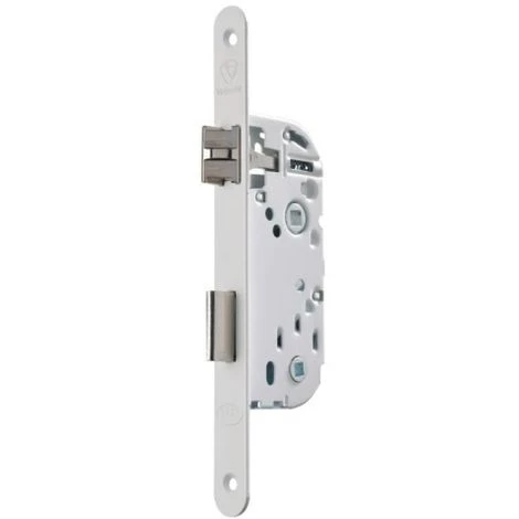 Coffre acier plié laqué : 134 x 60 mm. Têtière vernie à bouts ronds : 230 x 20 mm. Axe : 40 mm. Entraxe : 70 mm. Fouillot carré : 7 mm. Pêne demi-tour bombé avec languette de glissement. Trous de passage de rosaces perforés. Réversible. Sur demande : coloris beige RAL 7044.