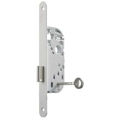 Coffre acier plié laqué : 134 x 60 mm. Têtière vernie à bouts ronds : 230 x 20 mm. Axe : 40 mm. Entraxe : 70 mm. Fouillot carré : 7 mm. Pêne demi-tour bombé avec languette de glissement. Trous de passage de rosaces perforés. Réversible. Sur demande : coloris beige RAL 7044.