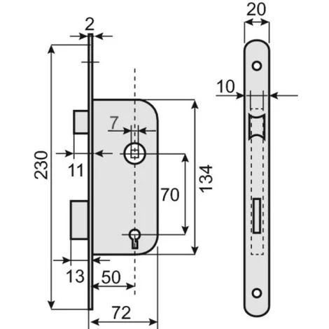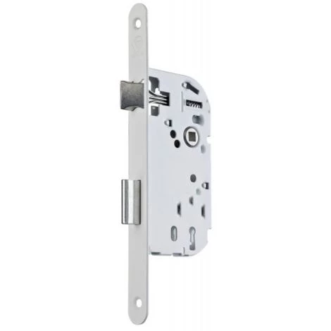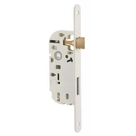 Pour construction économique. Réversibles sans démontage du coffre. Coffre en acier 10/10° : 135 x 62 mm en axe à 40 mm et 135 x 72 mm en axe à 50 mm. Têtière bouts ronds : 230 x 20 mm. Entraxe : 70 mm. Fouillot carré : 7 mm. Demi-tour laitonné. Trous de passage des vis de rosace. Finition : laqué blanc.