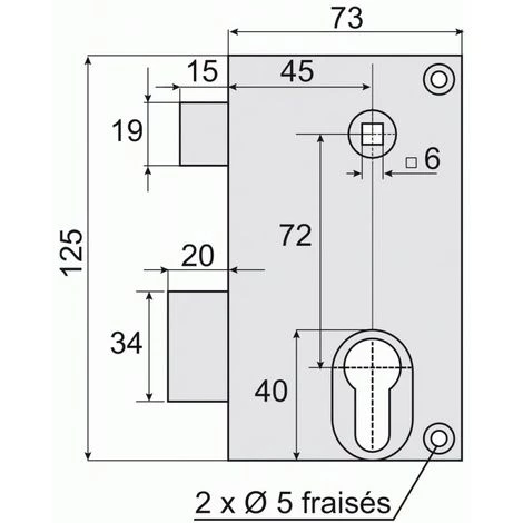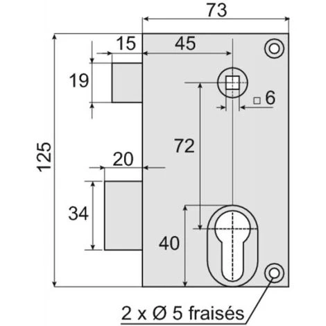 Serrures à cylindre européen série standingSerrure en applique verticale à fouillot – Pêne dormant et demi-tour – A cylindre européen – 7216 Coffre de 124 x 73 mm.